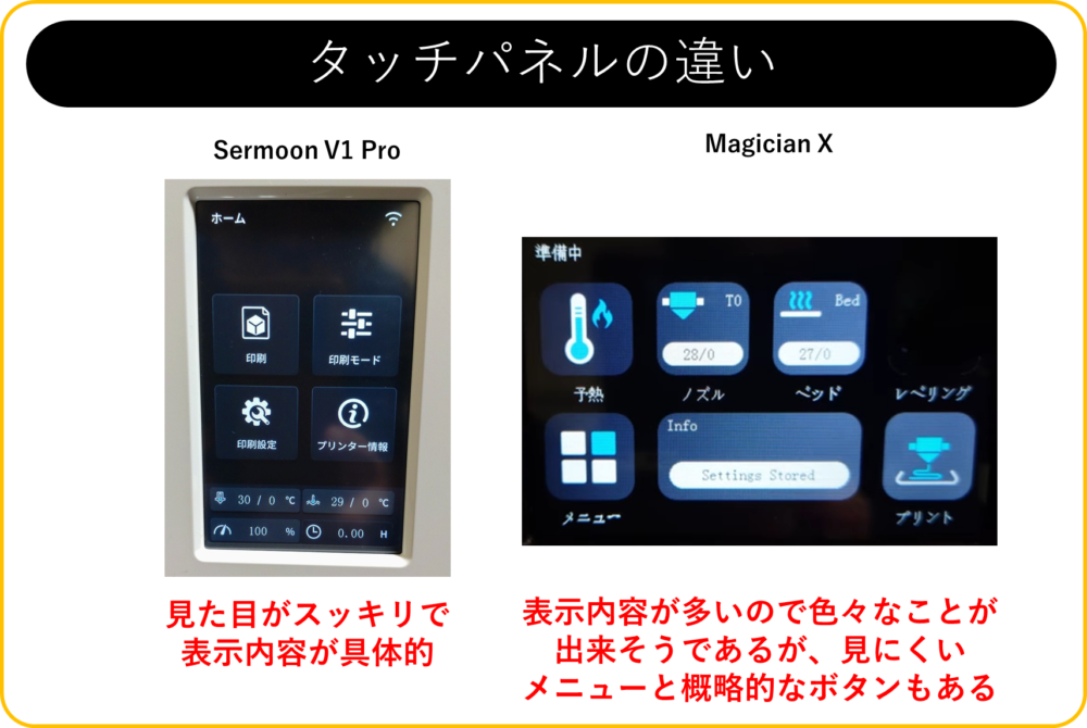 別の3DプリンターとしてMagician Xを上げてみます。Magician Xも日本語対応ですが、やりたい操作を完了させるのに何度も行ったり来たりする必要があり、手間がかかります。その上で、タッチパネル部の項目が少し複雑でわかりにくいです。