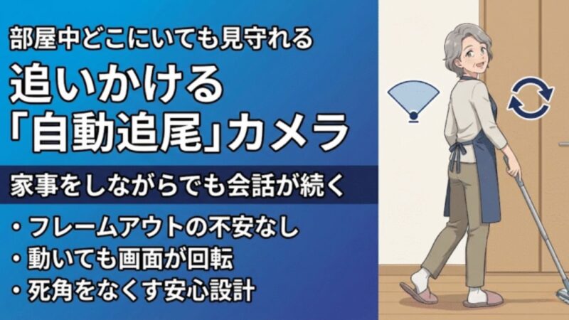 - 見守り機能:呼びかけ機能や自動追尾カメラで、離れていても「会える」安心感を実現。