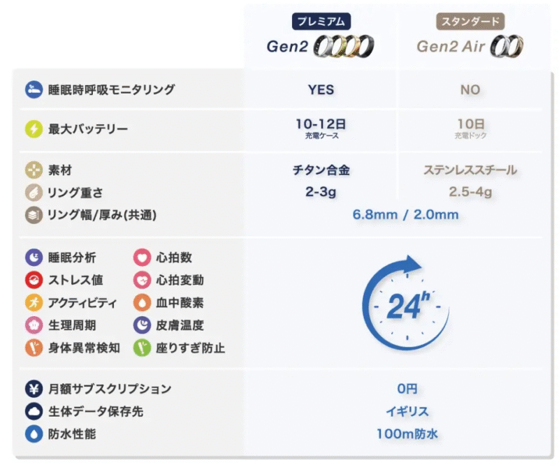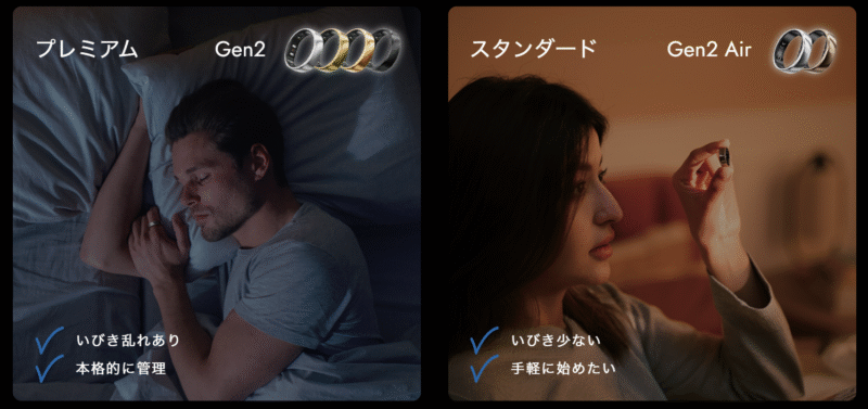 睡眠時無呼吸のモニタリングや出張での充電利便性を重視するならProモデルが最適ですが、日常使いにはGen 2 Airで十分な機能を備えています。