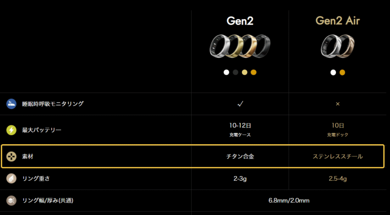 Gen 2 Airは価格と素材、付属品がProと異なり、睡眠時無呼吸モニタリング機能が省略されています。