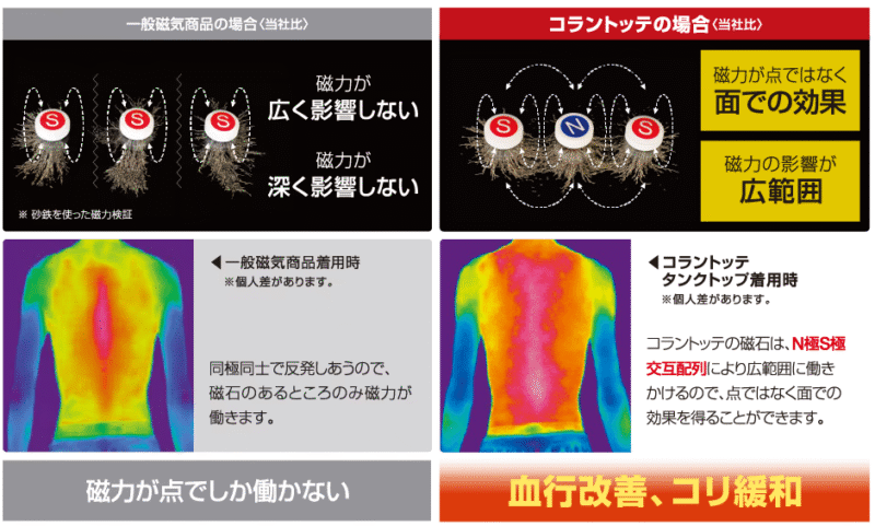 コラントッテの独自技術「N極S極交互配列」は、磁力が「面」で広範囲に働きかけます。