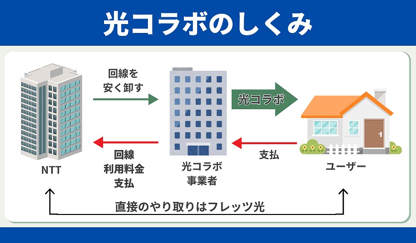 光コラボとは、NTT東日本・西日本の光回線を借りて、様々な事業者が独自のサービスを提供するインターネット接続サービスです。