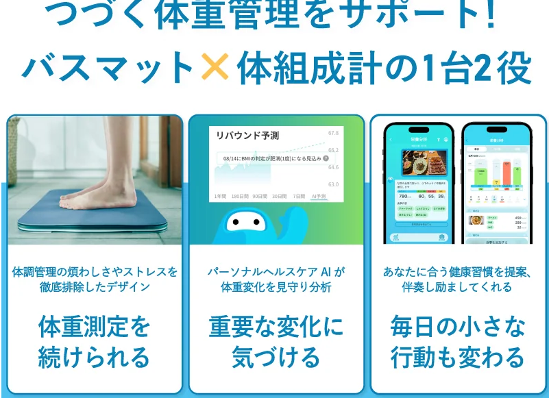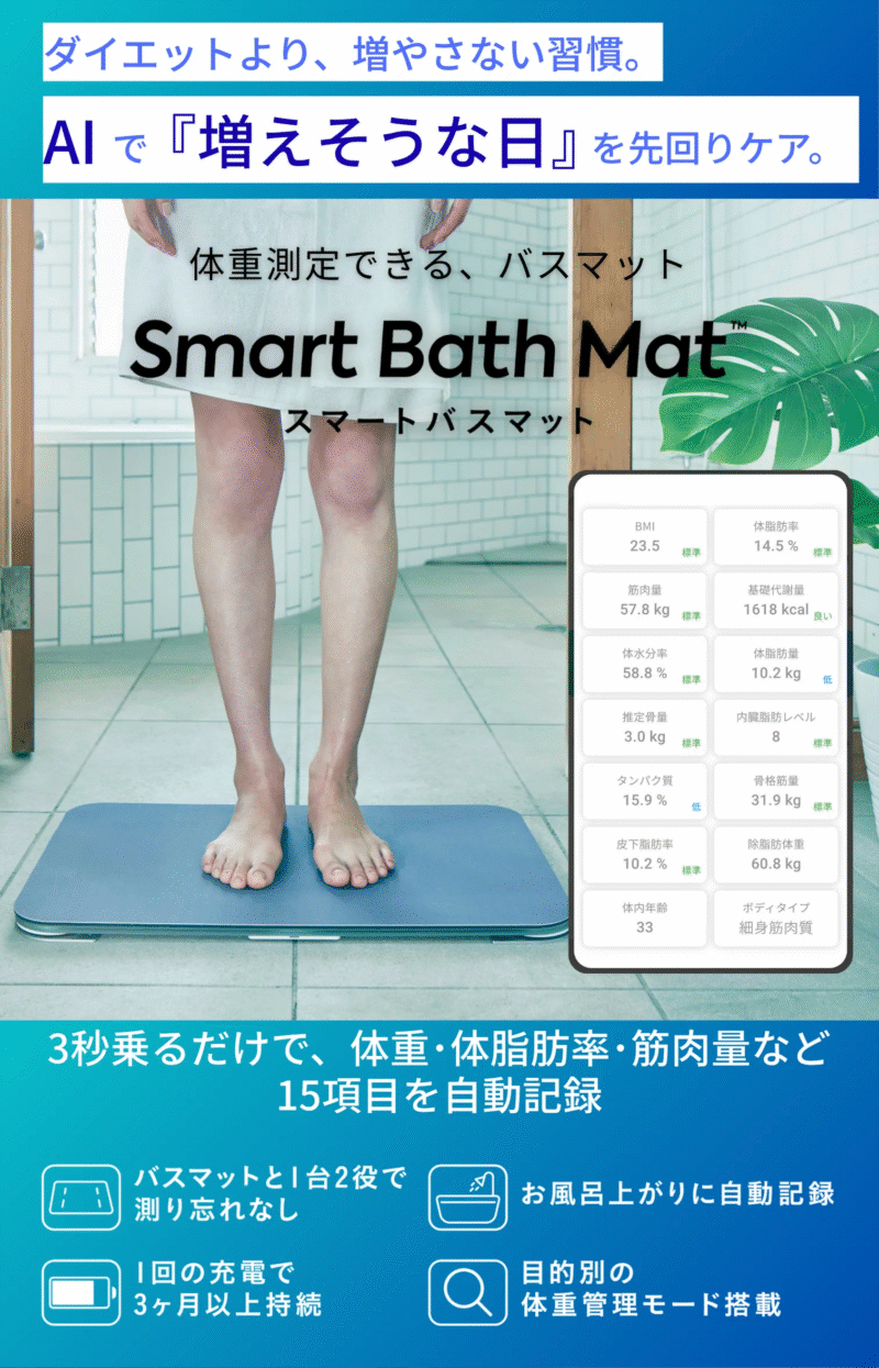 スマートバスマットは、これまで体重管理が続かなかった様々な悩みに寄り添い、”頑張らない”健康習慣を提案する画期的な一台です。